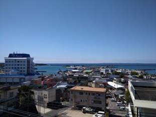 会場内風景(左)と会場から見た種子島港(右)